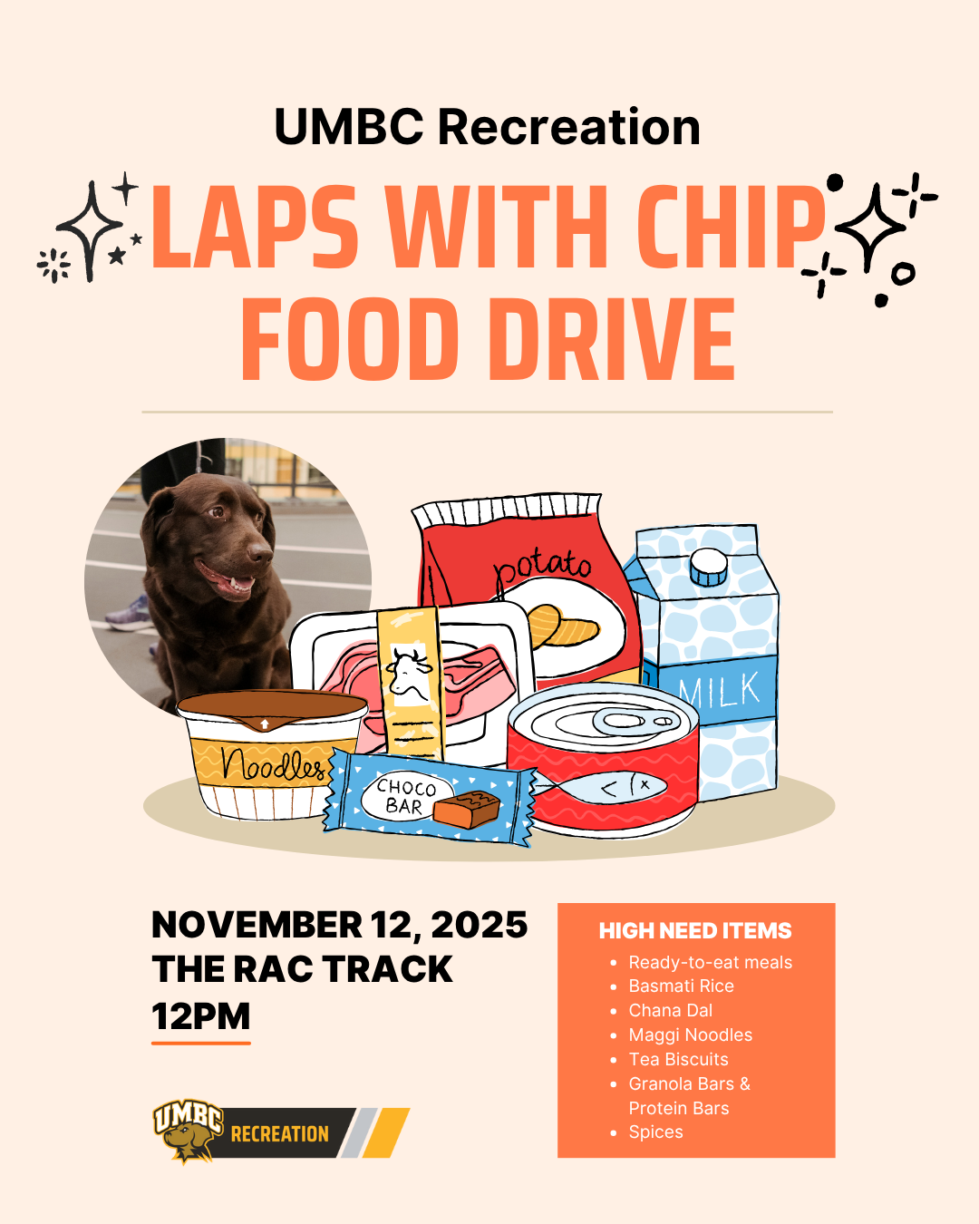 Join us on November 12th at 12pm on the RAC Track for our annual Laps With Chip Food Drive to benefit Retriever Essentials. Bring a non-perishable food item or an unopened toiletry to donate and get a limited edition Laps With Chip button! Visit https://retrieveressentials.umbc.edu/ for more information on what to donate or visit https://bit.ly/4oIV9lv to make a monetary donation. Just select Retriever Essentials as your designation.